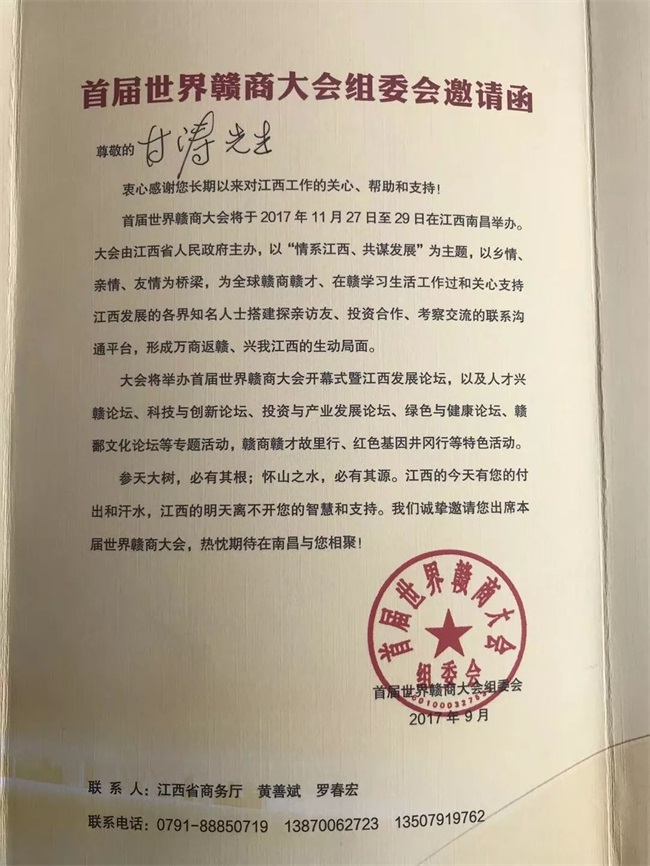 2017年11月27日,首屆世界贛商大會在昌舉行,程維、劉自鴻、王文京等一大批在全國乃至世界具有影響的贛商贛才齊聚南昌。書記、省長下榻相迎,以高禮遇和赤誠的心,歡迎天下贛商贛才回家!歐能達品牌創始人【甘濤】先生作為受邀嘉賓出席大會