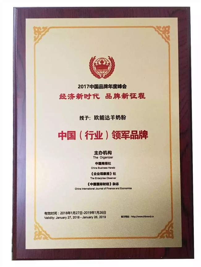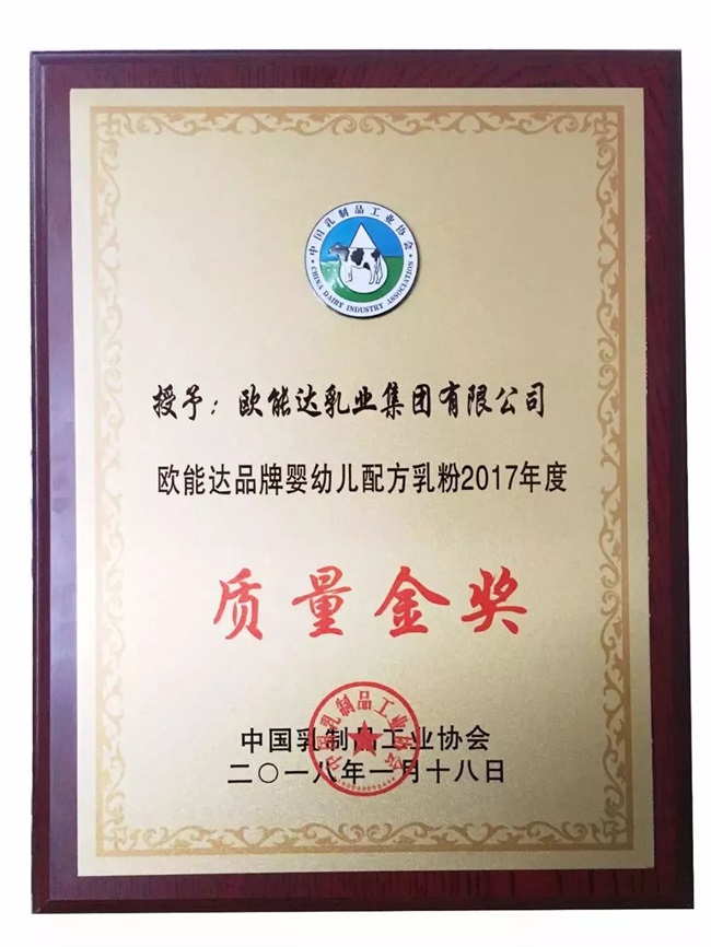 1、歐能達品牌于2018年1月18日榮獲由國家食藥總局指導中國乳協組織評選的“2017全國主流品牌嬰幼兒配方乳粉質量金獎”!