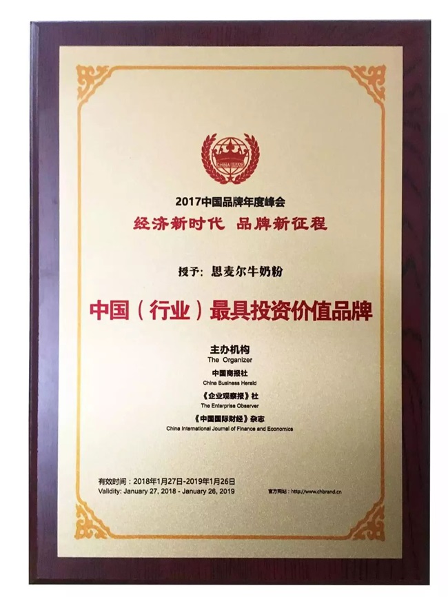 4、2018年1月27日,思麥爾品牌也取得了歷史性的突破,斬獲由中國商報社等單位組織評選的“中國(行業)具投資價值品牌”殊榮!