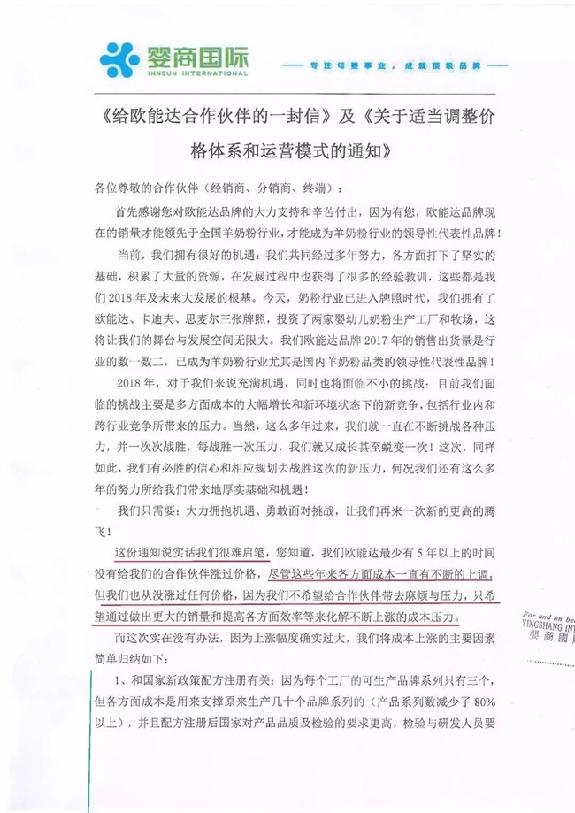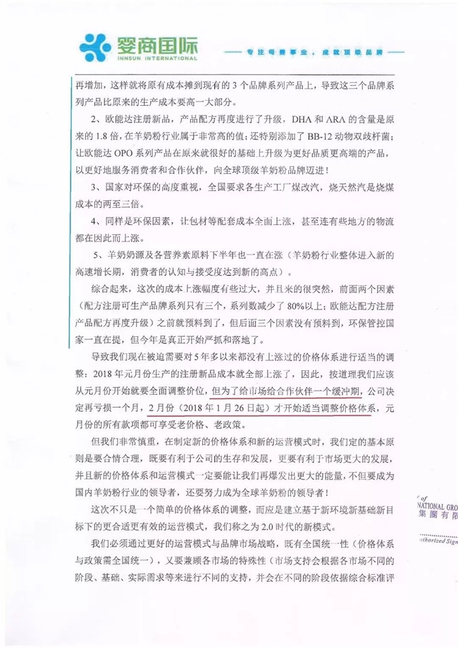 在分析如何應對成本過快上漲,尤其是近期新一輪奶源瘋漲帶來的巨大壓力時,甘董說,春節前我誠惶誠恐地給經銷商、合作伙伴親自寫了一封2000多字的交流信,信中提及被迫調整價格體系的五個方面原因:一是和國家新政配方注冊有關,二是注冊新品的配方再度升級,三是生產工廠煤改氣,四是國家環保政策導致包材等配套成本和有些地方的物流成本等全面上漲,五是羊奶奶源及各營養素原料成本的上漲。