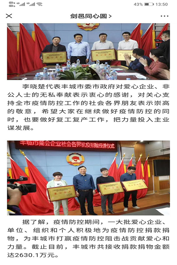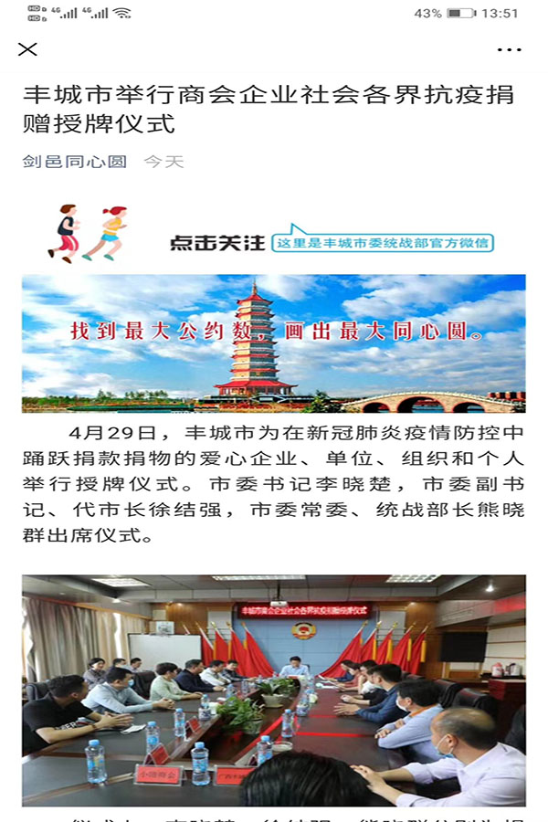 4月29日,江西省豐城市為在新冠肺炎疫情防控中踴躍捐款捐物的愛心企業、單位、組織和個人舉行授牌儀式, 市委書記李曉楚、市委副書記、代市長徐結強、市委常委統戰部長熊曉群出席儀式。