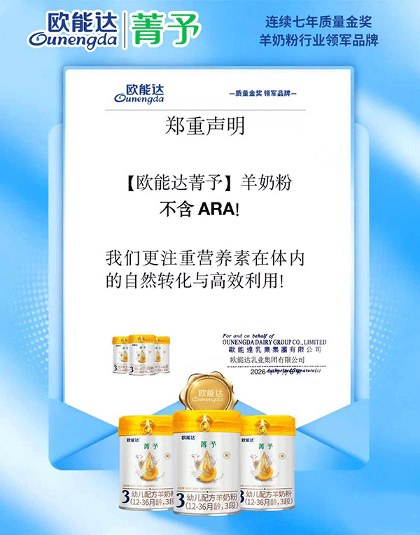 【鄭重聲明】歐能達(dá)菁予羊奶粉不含ARA,我們更注重營(yíng)養(yǎng)素在體內(nèi)的自然轉(zhuǎn)化與高效利用。聲明內(nèi)容如下: