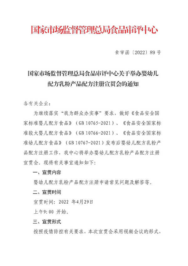 國家市場監督管理總局食品審評中心關于舉辦嬰幼兒配方乳粉產品配方注冊宣貫會的通知