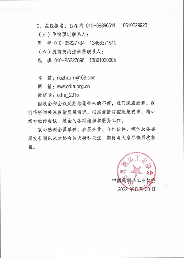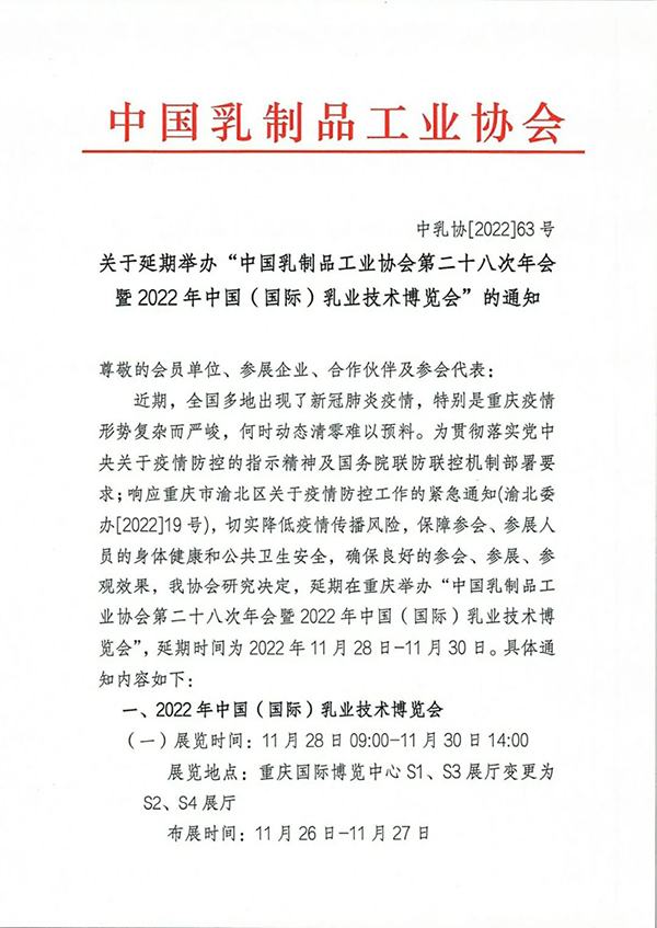 關于延期舉辦“中國乳制品工業(yè)協(xié)會第二十八次年會暨2022年中國(國際)乳業(yè)技術博覽會”的通知