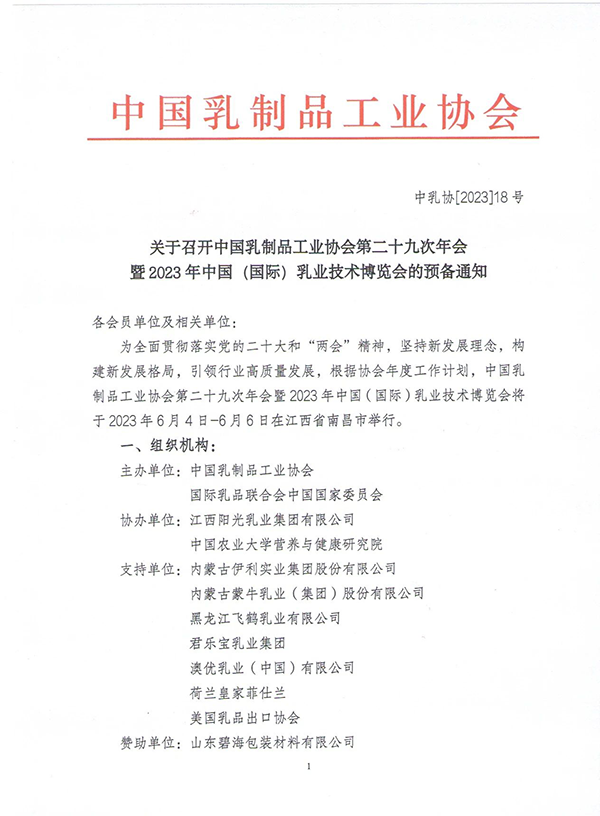 關于召開中國乳制品工業(yè)協(xié)會第二十九次年會暨2023年中國(國際)乳業(yè)技術博覽會的預備通知