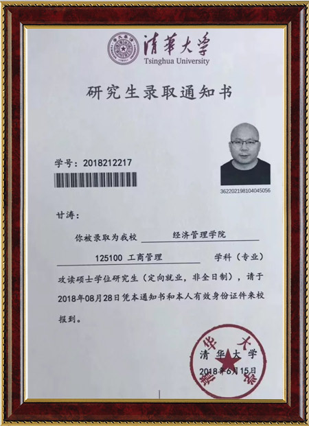 創(chuàng)始人甘濤先生2017-18年經(jīng)過(guò)資料審核、企業(yè)實(shí)地考察、面試、全國(guó)研究生統(tǒng)一考試等層層嚴(yán)格選拔,正式考上清華大學(xué)經(jīng)管學(xué)院工商管理研究生(EMBA),已從2018年9月份開(kāi)始正式入學(xué)!未來(lái),我們充滿期待!
