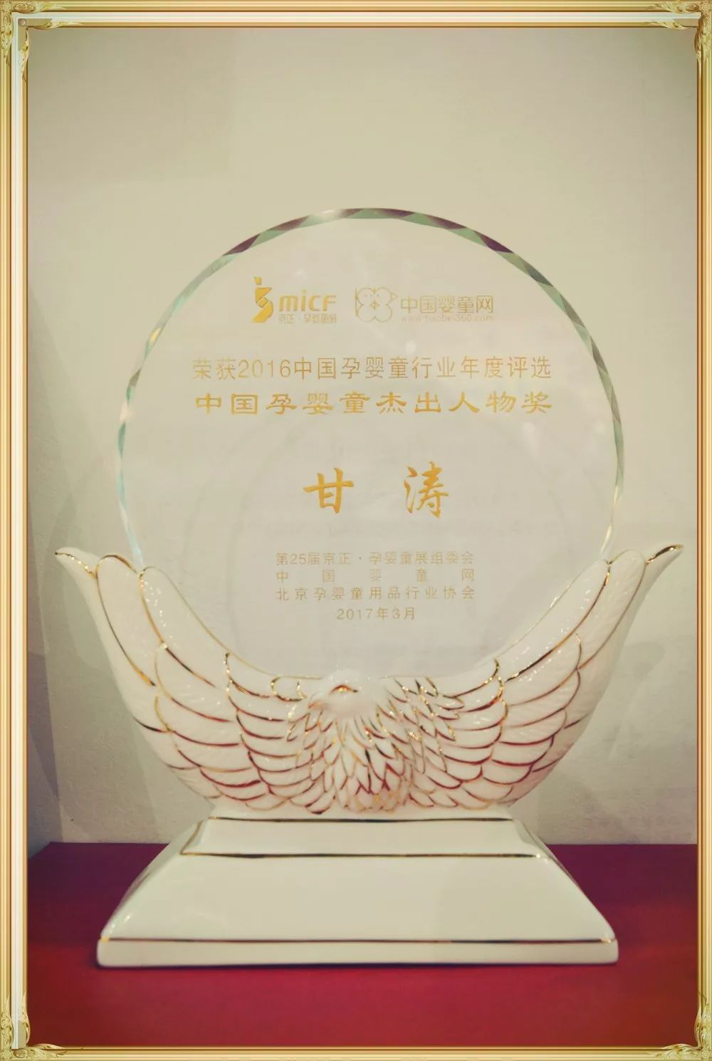 品牌創(chuàng)始人甘濤先生獲得“中國(guó)母嬰行業(yè)十大杰出人物獎(jiǎng)”,以贛籍企業(yè)家杰出代表身份受江西省政府邀請(qǐng)參加“首屆世界贛商大會(huì)”,當(dāng)選中國(guó)乳協(xié)理事,當(dāng)選中國(guó)母嬰產(chǎn)業(yè)聯(lián)盟副理事長(zhǎng)。