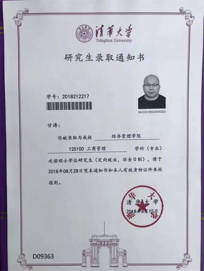 2017年,甘濤先生通過嚴格面試及全國研究生統考,已考上清華大學經濟管理學院高級工商管理研究生,將于2018年8月份正式報到入學。