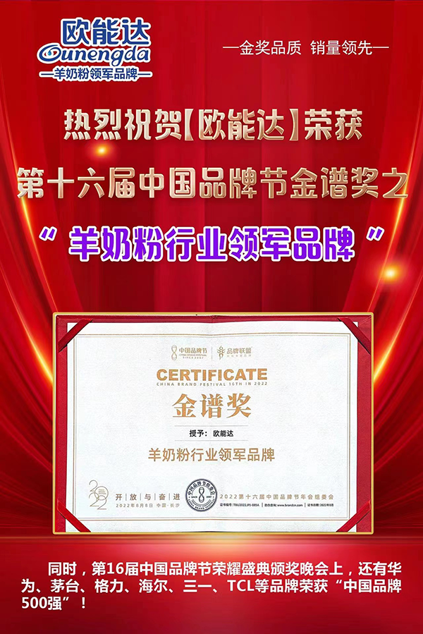 在本屆品牌節年會上,歐能達品牌憑借其在母嬰行業12年的深耕和努力,憑借其在母嬰行業的影響力及所做的貢獻,榮獲十六屆中國品牌節金譜獎“羊奶粉行業領軍品牌”、
