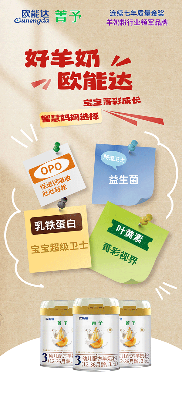 智慧媽媽選歐能達(dá)菁予羊奶粉? 連續(xù)七年質(zhì)量金獎,行業(yè)領(lǐng)軍?? 含 OPO 促鈣吸收、益生菌守護(hù)腸道、乳鐵蛋白增強(qiáng)防護(hù)、葉黃素助力視界?? 給寶寶 “菁” 彩成長,好羊奶就選歐能達(dá)~